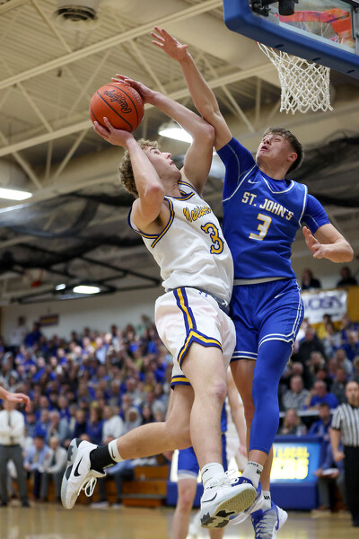Marion Local's Luke Everman (10) boxes out Delphos St. John's Maddox Kroeger (21).