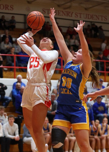 St. Henry's Morgan Baumer (3) goes up for a shot against Marion Local.