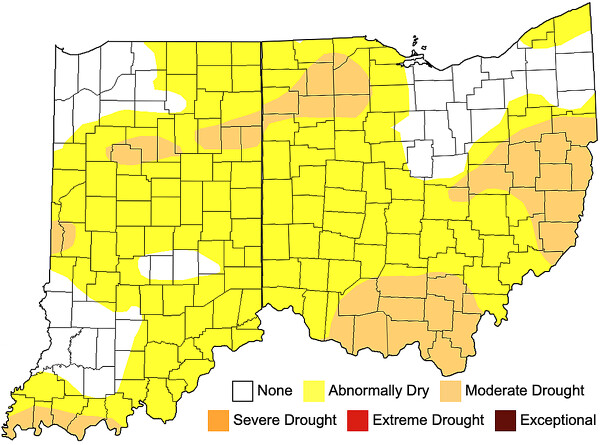 CELINA - Drought conditions are creeping into parts of Ohio, including an "abnormally dry" status in northern Mercer County, causing corn and soybeans to prematurely age, or senesce, and potentially spurring farmers to harvest their crops earlier than normal to ward off losses.