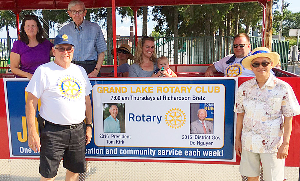Rotary District 6600 Governor Do K. Nguyen, front right, and Jim Mustard, front left, view signage on Grand Lake Rotary EXPRESS train prior to the Celina Lake Festival parade.